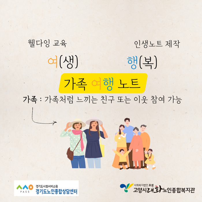 [부자동네타임즈 김인수기자] 고양시대화노인종합복지관에서는 경기도(Well-dying) 문화 조성 사업의 일환으로 시행되는 ‘경기도 어르신 인생노트 사업’수행기관으로 ‘가족여행 노트’가 최종 선정됐다. ‘가족여행 노트’는 웰다잉 교육을 통해 지난날의 행복을 찾아보고 나를 돌아 볼 수 있는 인생노트를 제작하는 프로그램이다.