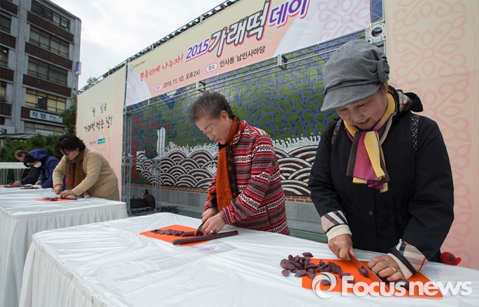 (서울=포커스뉴스) 10일 오후 서울 종로구 인사동길 광장에서 열린 11월 11일 가래떡데이 행사에서 ‘한석봉 어머니 찾기’ 대회에 참가한 참가자들이 가래떡 썰기 경연을 펼치고 있다.