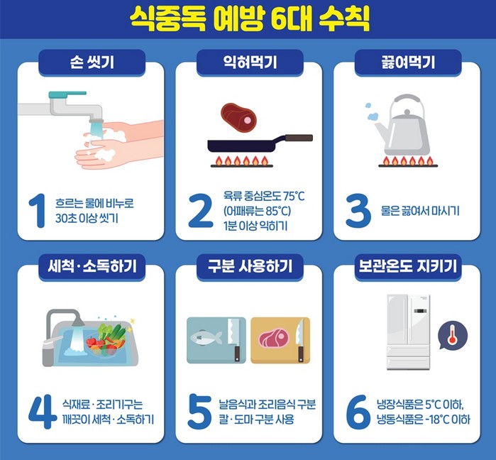 감염병 예방을 위해서는 흐르는 ▲물에 30초 이상 비누로 손 씻기 ▲음식 충분히 익혀 먹기 ▲물은 끓여 마시기 ▲채소, 과일은 깨끗한 물에 씻어 껍질을 벗겨 먹기 ▲칼, 도마 조리 후 소독 ▲생선·고기·채소는 도마를 분리하여 사용하기 등의 예방 수칙을 반드시 준수해야 한다.