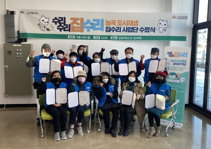 [부자동네타임즈 김인수기자] 고양시는 "주민들이 직접 소규모 노후주택을 수리하고 취약계층의 주거환경을 개선할 수 있도록 지원하는 ‘능곡 도시재생 집수리 사업단 육성교육’을 지난 14일 성공적으로 마쳤다."고 밝혔다. 이번 교육의 수료생은 모두 11명이다.