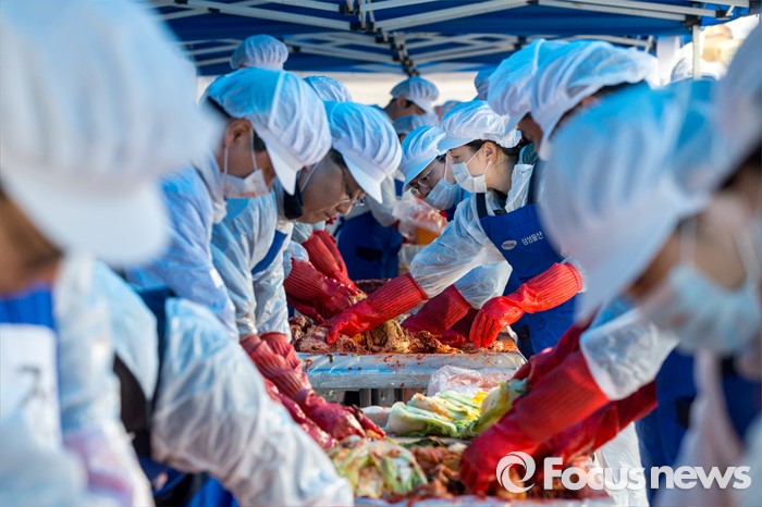 (서울=포커스뉴스) 10일 오전 서울 서초구 남부순환로 서초구청에서 열린 김장나누기 행사에 참가한 삼성물산 임직원들이 김장을 담그고 있다.