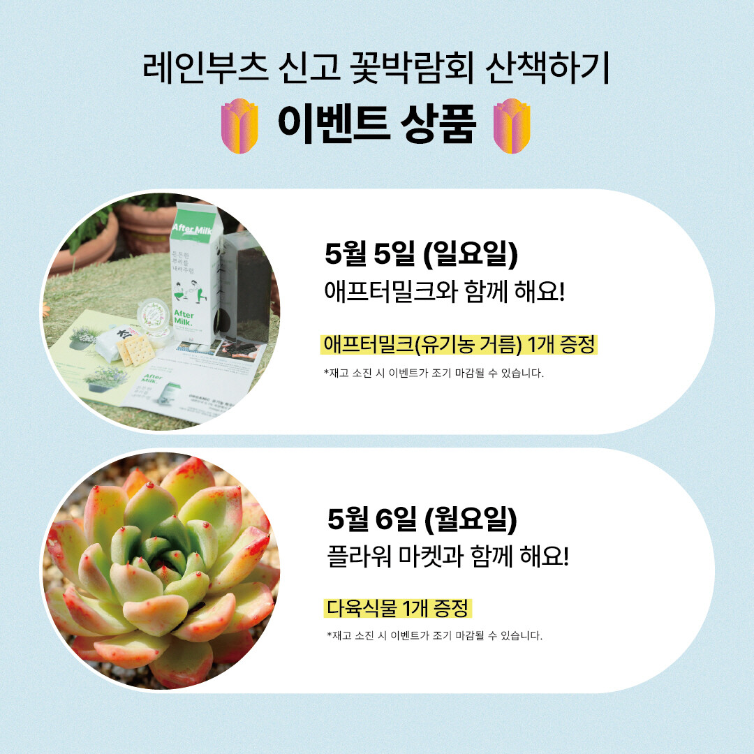 이벤트에 참여한 관람객은 실내전시관 1층 안내데스크(고양꽃전시관 1층)에서 상품을 수령 할 수 있다. 재단은 5일에‘애프터밀크(유기농 거름)’를 제공하고 6일에는‘다육식물’ 을 제공하며, 재고 소진 시 조기 마감될 수 있다.