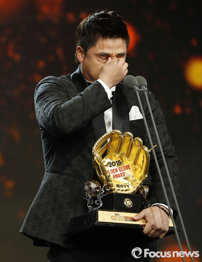 | △ 8일 오후 서울 서초구 The-K호텔에서 열린 2015 KBO 골든글러브 시상식에서 3루수 부문을 수상한 NC 박석민이 수상소감을 말하다 눈물을 흘리고 있다. <사진제공=포커스뉴스> |