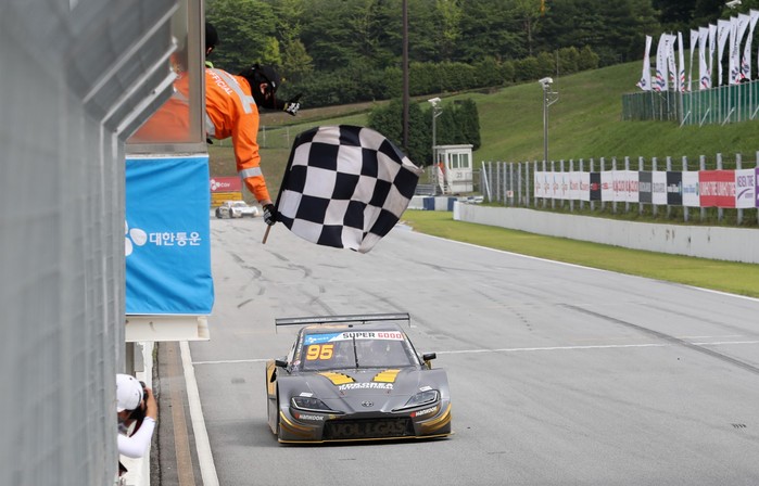 [사진설명] 김재현이 지난 5일 에버랜드 스피드웨이에서 열린 2020 CJ대한통운 슈퍼레이스 챔피언십 3라운드 슈퍼 6000 클래스 결승에서 가장 먼저 체커기를 받고 있다.