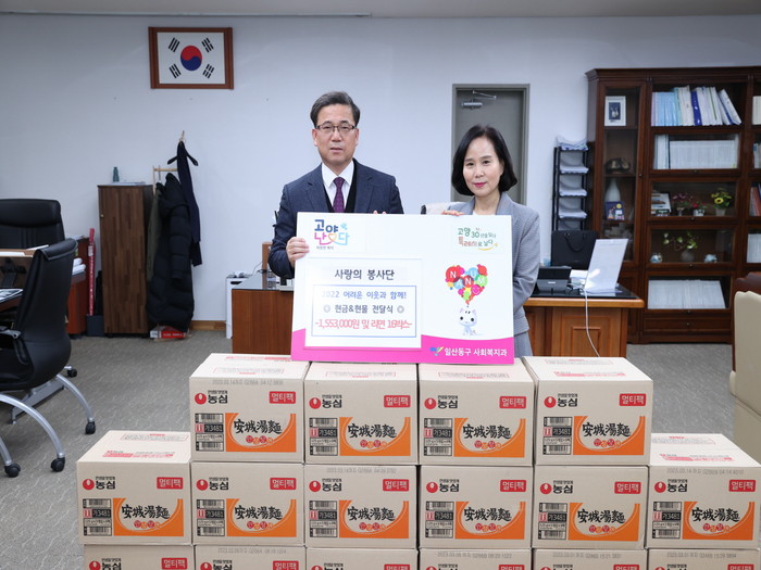 [부자동네타임즈 김인수기자] 고양특례시 일산동구는 지난 15일 ‘고양난다(복지나눔 1촌맺기)’ 사업의 일환으로 법원공무원교육원 ‘사랑의 봉사단’으로부터 기부금 1,553,000원과 라면 16박스를 기탁 받았다고 밝혔다.