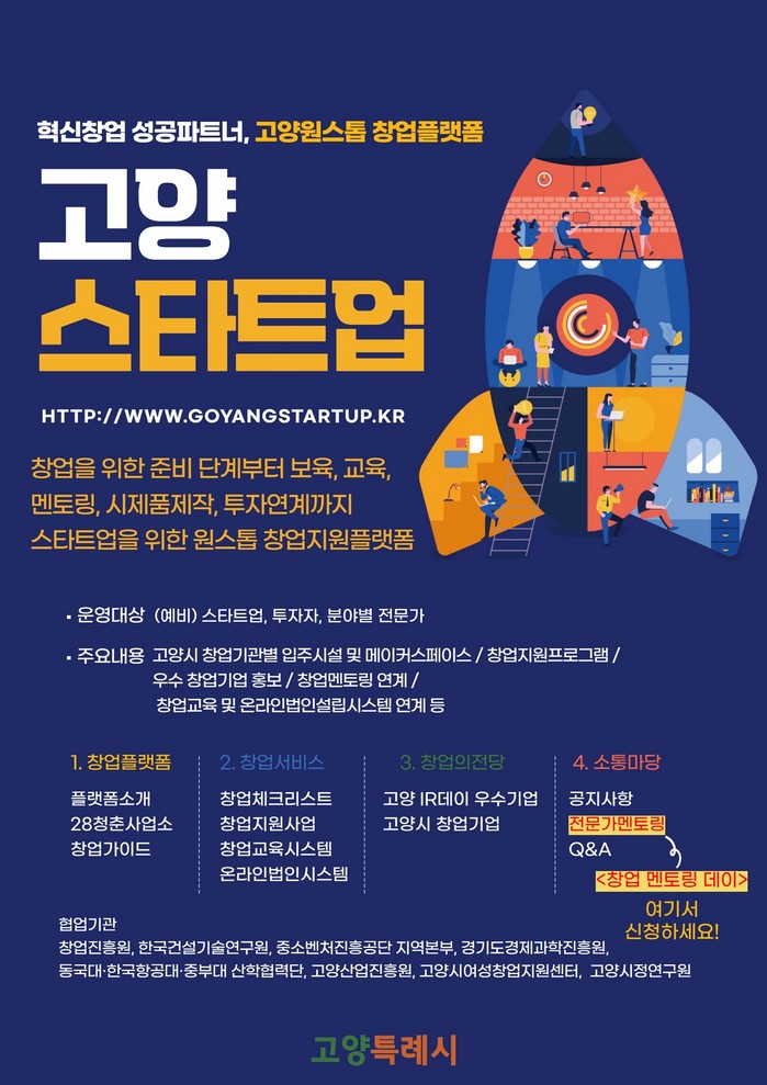 시는 기존 고양스타트업 플랫폼의 소통마당 카테고리 내에 전문가 멘토링 프로그램을 추가, ‘창업 멘토링 데이’ 시스템을 구축했다.