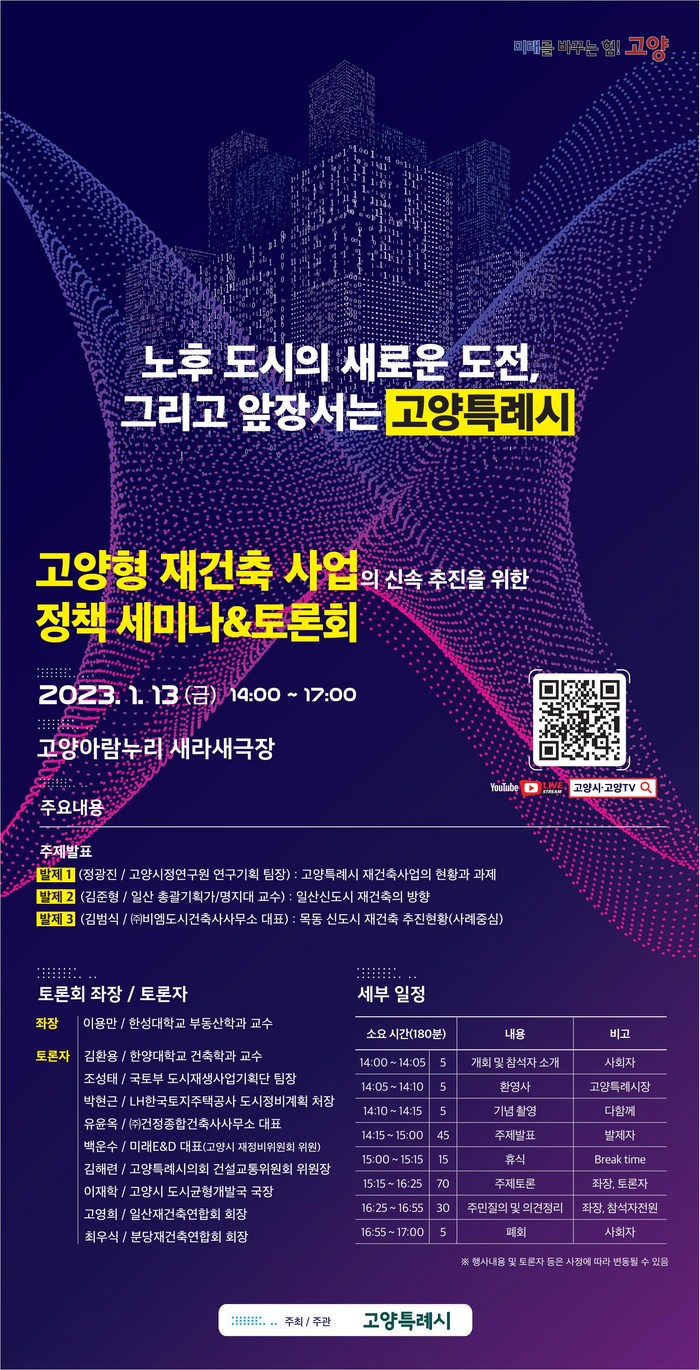 이동환 시장은 “토론회를 바탕으로 민선8기 공약인 주민 맞춤형 재건축을 신속히 추진하겠다. 고양의 미래를 바꾸기 위한 도전을 시민과 함께 나아갈 것”이라며 “좋은 의견이 수렴될 수 있도록 많은 고양시민이 참석해 주시기 바란다”고 전했다.