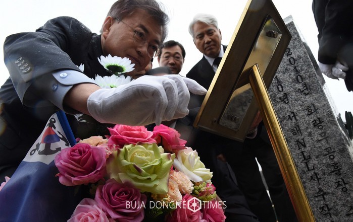 [부자동네타임즈 이장성기자]문재인 전 더불어민주당 대표는 천안함 사건 7주기인 26일 희생 장병 46인 등을 추모했다. 문 전 대표는 이날 오후 5시20분께 대전 유성구 국립대전현충원을 찾아 순국선열과 1·2차 연평해전, 천안함 46용사, 고(故) 한주호 준위의 묘역 등을 잇달아 찾아 잇따라 참배했다.