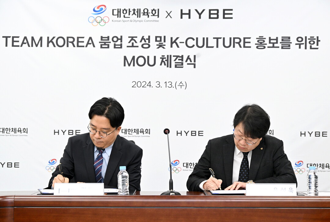 대한체육회는 하이브가 보유하고 있는 대한민국 음악 및 문화산업 프로젝트 수행 경험을 바탕으로, 국내·외 응원 문화 혁신과 선도, K-Culture 공동 홍보 등을 위해 적극 협력할 것을 약속했다. 특히 이번 협약으로 하이브는 대한체육회와 함께 2024 파리하계올림픽대회에 나서는 팀코리아 선수단을 응원하는 다양한 콘텐츠를 전 세계에 소개할 예정이다.