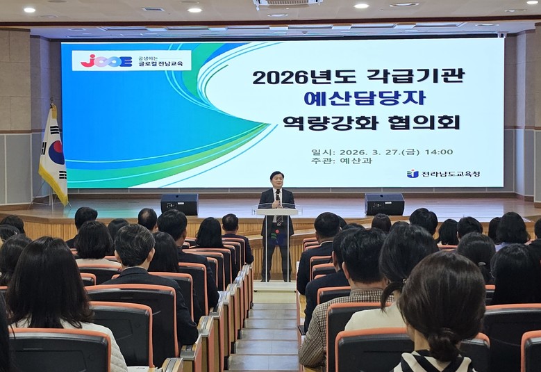 [부자동네타임즈=이의수 기자] 전라남도교육청이 27일 전남교육청교육연구정보원에서 ‘2026년 예산업무 담당자 역량강화 협의회’를 열어, 상반기 신속집행 추진과 재정 운영 전략을 공유했다.