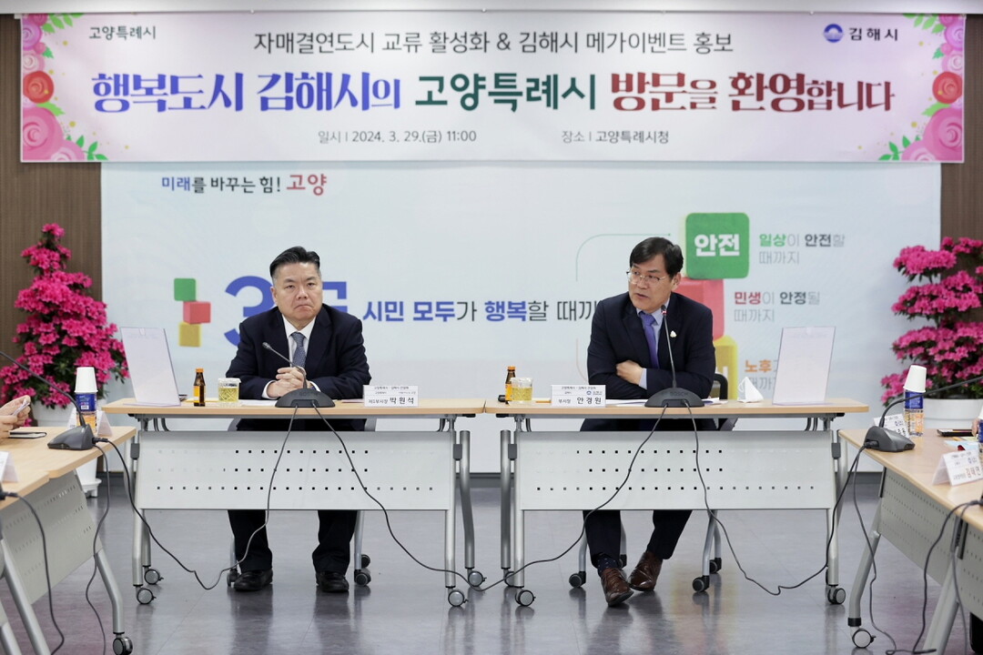 고양특례시 박원석 제1부시장은 “자매도시 김해시가 고양특례시에 다시 한번 오시게 되어 매우 영광이다. 올해 김해시 3대 메가이벤트의 성공적인 추진을 기원하며, 앞으로 더욱 교류와 협력이 활성화되길 기대한다”라며 방문을 진심으로 환영했다.