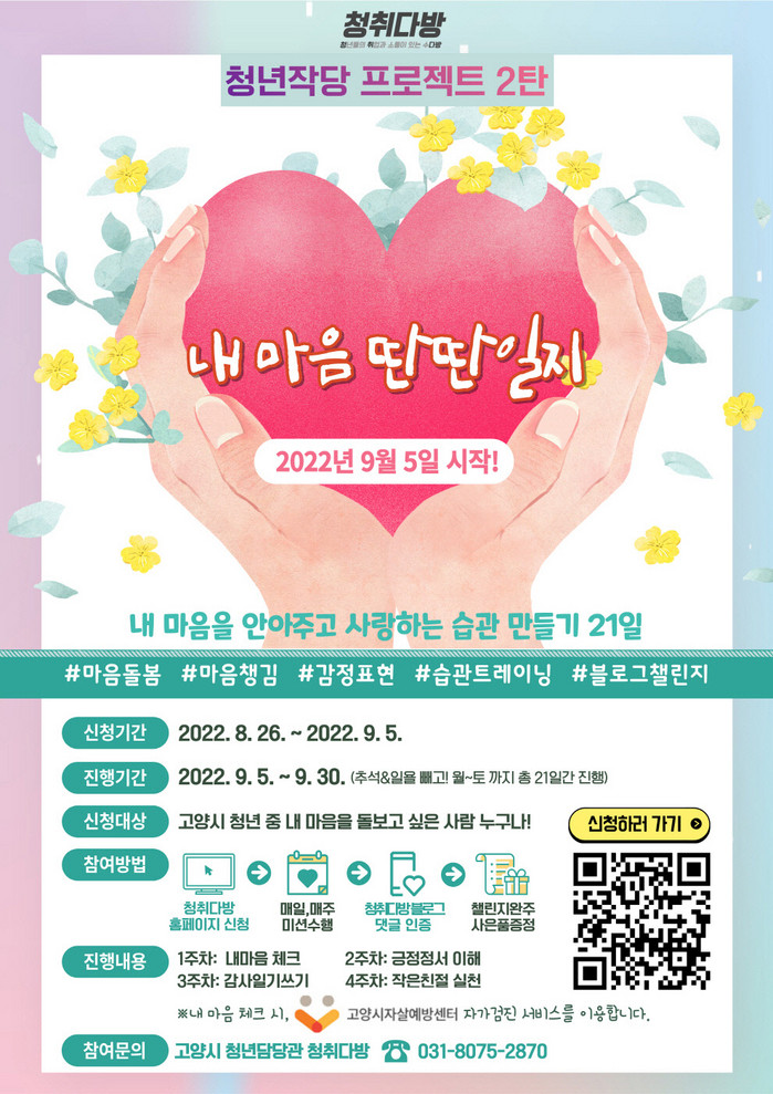 한편, 고양시는 청년작당 프로젝트 ‘청취다방 2022년 작심삼일은 없당’을 진행하고 있다. 혼자서는 만들기 어려운 습관을 다른 청년들과 함께 챌린지로 길러보는 프로젝트다. 지난 6월 ‘나의 환경해방일지’가 성황리에 완료됐으며 9월 ‘내마음딴딴일지’ 이후에는 11월에 ‘다가올 내일·지’가 진행될 예정이다.