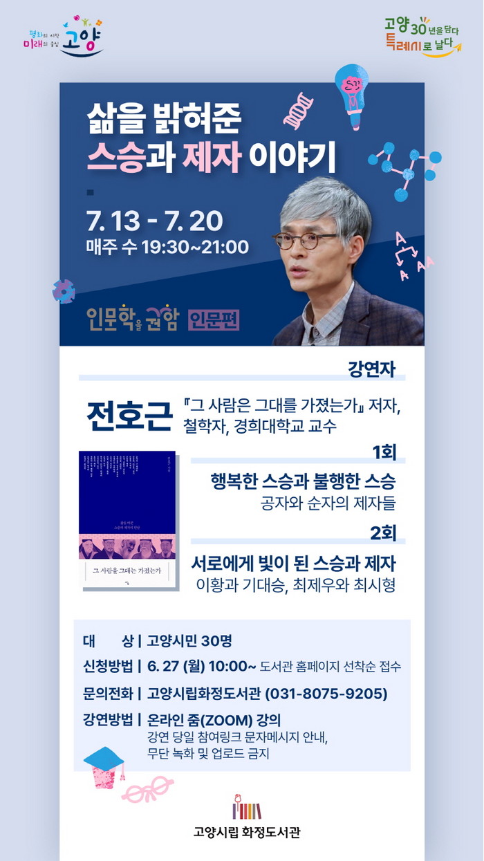 7월 강연은 6월 27일(월) 10시부터, 8월 강연은 8월 8일(월) 10시부터 고양시 도서관센터 홈페이지에서 각각 신청할 수 있으며, 기타 자세한 사항은 화정도서관으로 문의하면 된다.