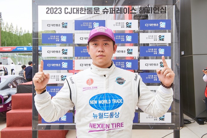 [사진 설명] 22일 경기도 용인에 위치한 에버랜드 스피드웨이에서 열린 2023 CJ대한통운 슈퍼레이스 챔피언십 슈퍼 6000 클래스 1라운드 우승자 김재현(넥센-볼가스 모터스포츠)이 우승 후 기념 촬영했다.