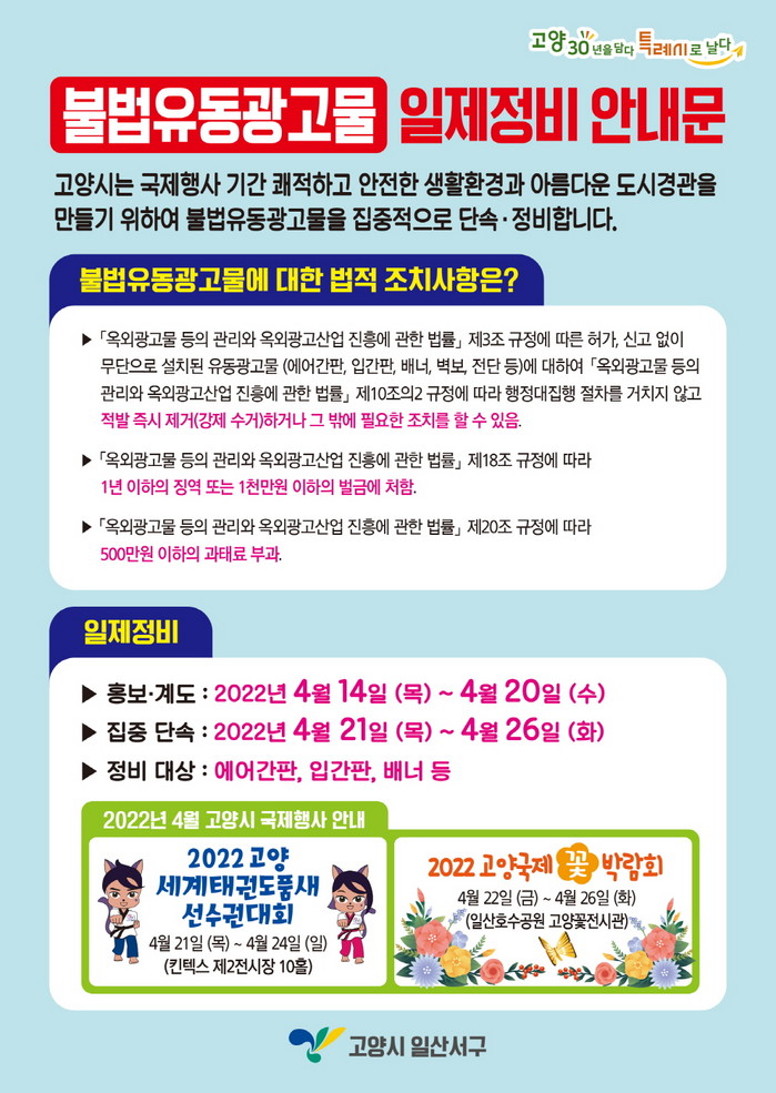 이번 특별 계도·정비는 4월 고양시에서 개최되는 주요 국제행사인 ‘고양 세계태권도품새선수권대회’(4.21.~4.24.)와 ‘고양국제꽃박람회’(4.22.~4.26.)의 성공적인 개최를 지원하기 위해 실시된다.