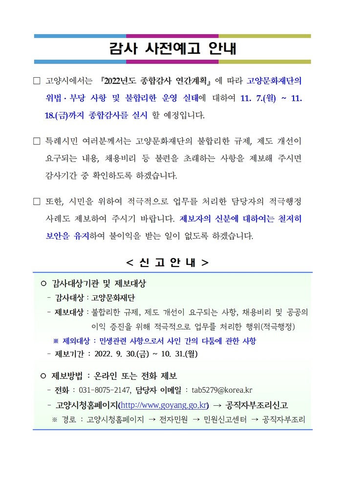 한편 고양특례시는 제보사항에 대하여 감사기간 중 사실 여부를 확인해 잘못된 사항에 대해서는 시정 등의 조치를 하며, 감사결과를 고양시청 홈페이지에 공개할 예정이다.