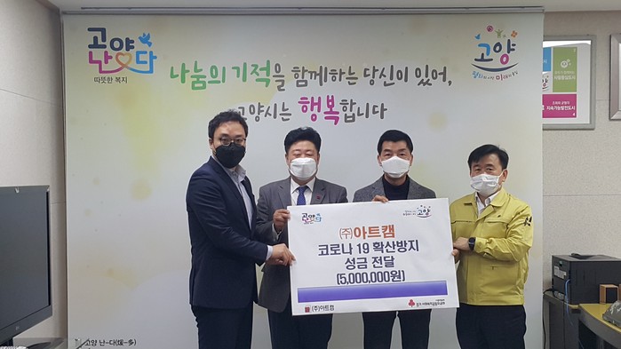 이번에 전달된 성금 500만원은 ㈜아트캠에서 코로나 19 확산방지를 위해 마스크 등 방역물품 구입에 어려움을 겪는 고양시 저소득 취약계층을 위해 마련한 것으로 경기북부 사랑의 열매를 통하여 저소득 대상자에게 성금으로 지원 될 예정이다.