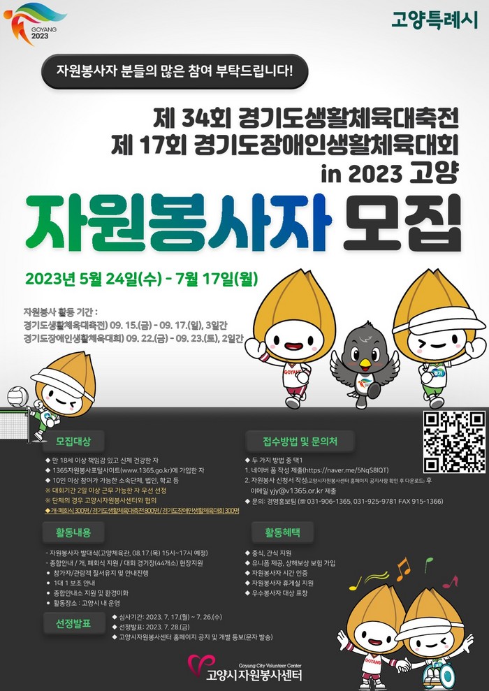 [부자동네타임즈 김인수기자] 고양시자원봉사센터(이사장 이동환)는 오는 9월에 열리는 제34회 경기도생활체육대축전 & 제17회 장애인생활체육대회에서 활동할 자원봉사자를 모집한다고 8일 밝혔다.