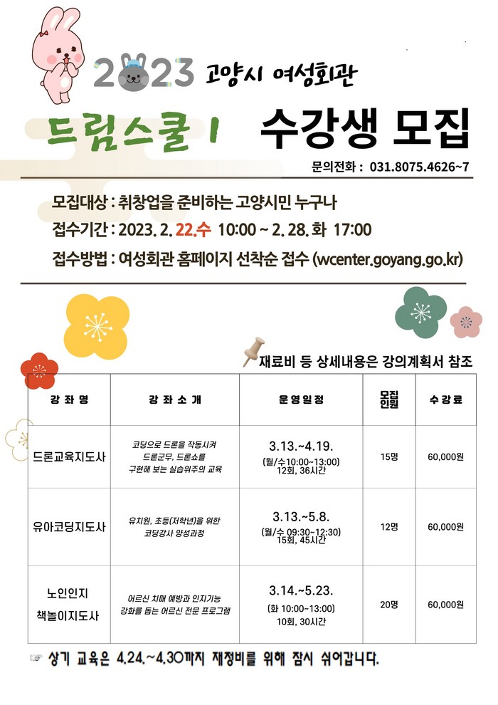 수강신청은 여성회관 홈페이지를 통해 2월 22일부터 선착순으로 접수할 수 있다. 자세한 사항은 고양시 여성회관 홈페이지에서 확인하면 된다.