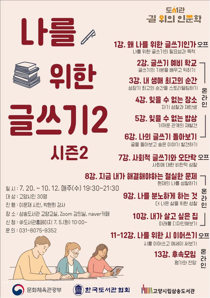 ‘나를 위한 글쓰기2’는 문화체육관광부가 주최하고 한국도서관협회가 주관하는 길 위의 인문학 공모사업이다. 삼송도서관은 작년에 이어 두 번째로 선정됐다. 시즌2는 작년에 강의를 진행한 이문재 시인과 박현희 강사가 한층 완성된 프로그램으로 시민과 만날 예정이다.