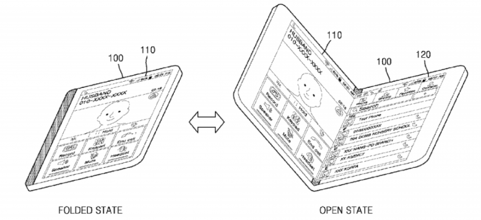 이번에 공개된 디자인은 세 가지다. 우선 가운데 경첩이 있어 책처럼 접고 펼 수 있는 디자인이다. 하지만 기존 '플립폰'과 다르다. 화면이 접힌 상태에서도 구동이 가능하며 펼쳤을 때 화면이 두 배로 커지는 방식이다.