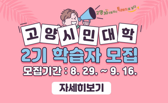수강신청은 고양시 평생학습포털에서 8월 29일부터 온라인 접수로 진행된다. 문의는 고양시 민원콜센터(☎031-909-9000)나 고양시 평생교육과(☎031-8075-2294)로 하면 된다.