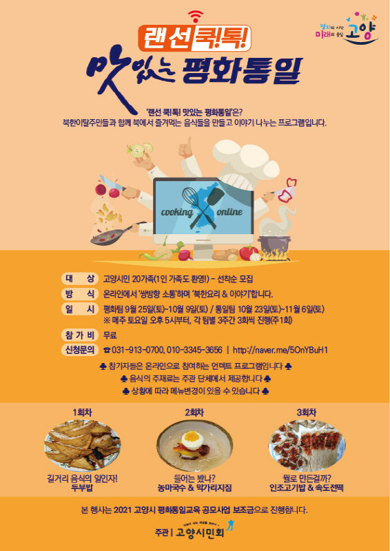[부자동네타임즈 김인수기자] 고양시가 음식이라는 친근한 소재를 통해 쉽게 북한의 문화를 이해하고 남북의 거리감을 좁히기 위해 9월 25일부터 온라인 요리 프로그램 ‘랜선 쿡! 톡! 맛있는 평화통일’ 프로그램을 진행한다.