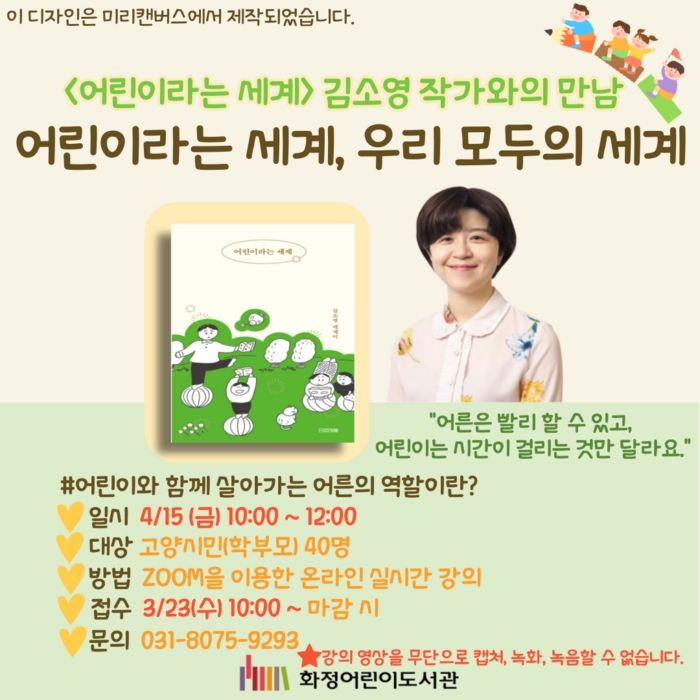 [부자동네타임즈 김인수기자] 고양시 화정어린이도서관은 온라인 저자 특강인 ‘어린이라는 세계 김소영 작가와의 만남’을 운영한다고 밝혔다.