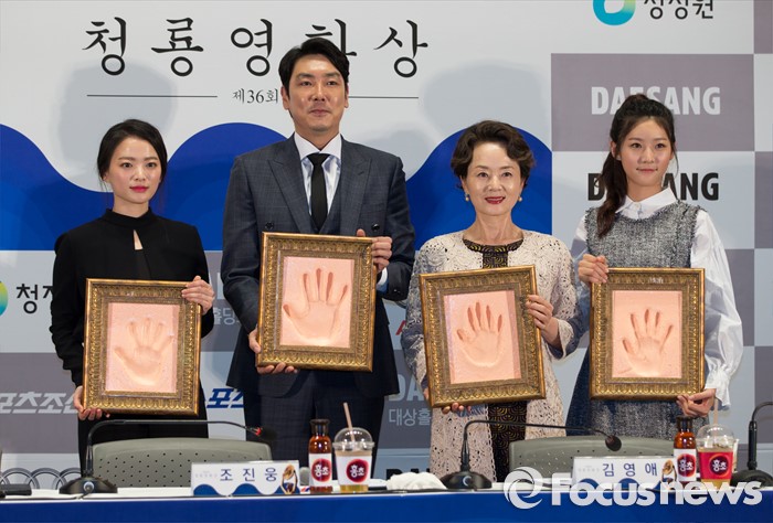 (서울=포커스뉴스) 5일 오후 여의도 CGV에서 열린 제 36회 청룡영화상 핸드프린팅 행사에 배우 천우희(왼쪽부터), 조진웅, 김영애, 김새론이 참석해 핸드프린팅을 들어 보이고 있다.