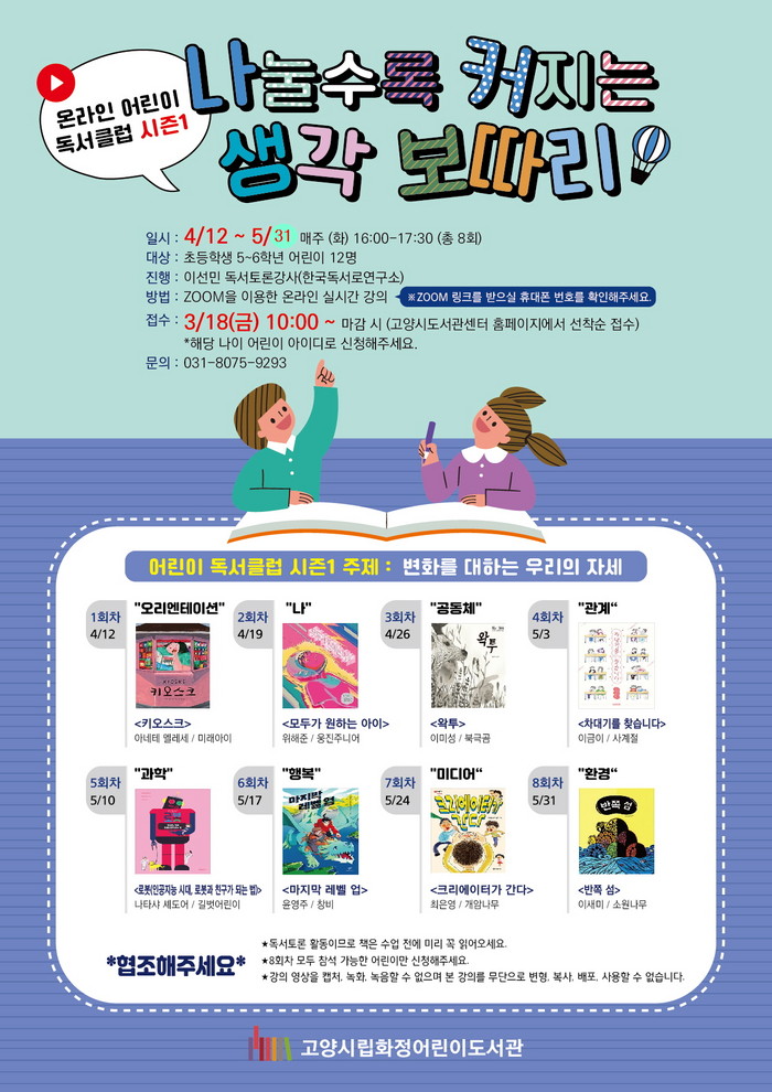 이번 어린이 독서클럽 시즌1 주제는 ‘변화를 대하는 우리의 자세’이며, 4월 12일 ‘오리엔테이션’, 4월 19일 ‘나’▲4월 26일 ‘공동체’, 5월 3일 ‘관계’, 5월 10일 ‘과학’, 5월 17일 ‘행복’, 5월 24일 ‘미디어', 5월 31일 ‘환경’이라는 다양한 주제로 어린이들이 함께 토론하며 서로 생각을 나누는 시간을 가지게 된다.