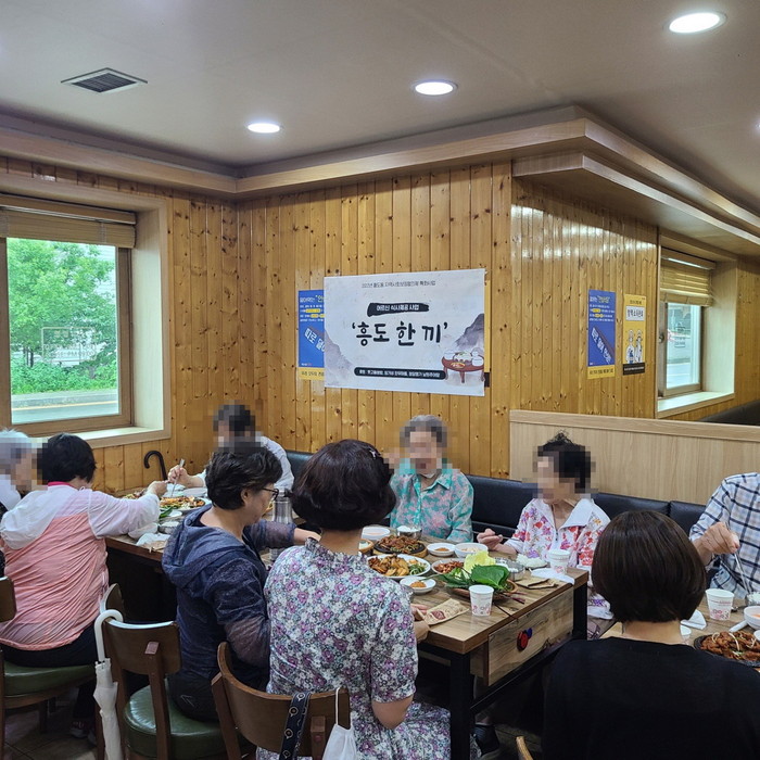 흥도 한 끼 사업은 흥도동 지역사회보장협의체 특화사업의 일환으로 85세 이상 독거어르신 76분을 격주에 한 번씩 식당에 모셔 식사를 대접하는 사업이다.