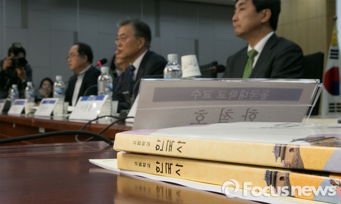 | △ 지난달 22일 오전 서울 여의도 국회 의원회관에서 새정치민주연합 한국사교과서 국정화 저지 특위 주최로 열린 '한국사 교과서 대표 집필진에게 듣는다' 토론회에 고등학교 한국사 교과서가 놓여 있다. <사진제공=포커스뉴스> |