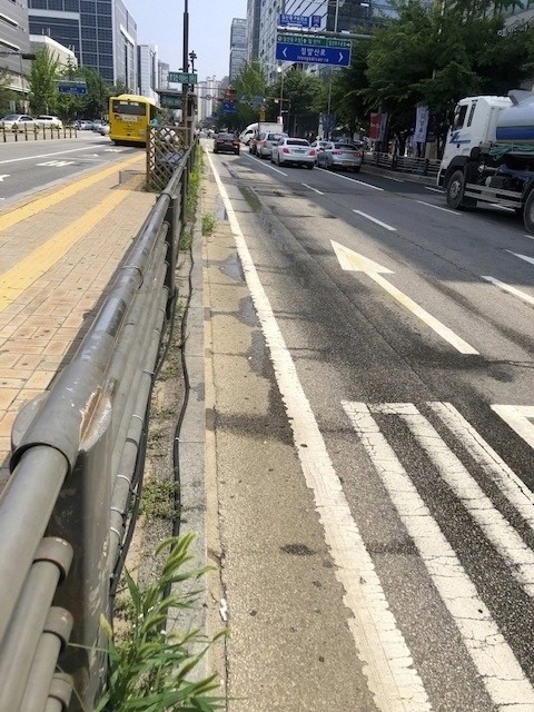 노면 물분사 온도저감장치는 폭염대비를 위해 지난해 구에서 설치한 장치로, 승강장 보도 블럭에 50m 길이의 노즐을 부착해 일반차로 방향 노면에 물을 분사하는 장치이다. 물은 매일 1회 물탱크에 담수를 담아 사용한다.