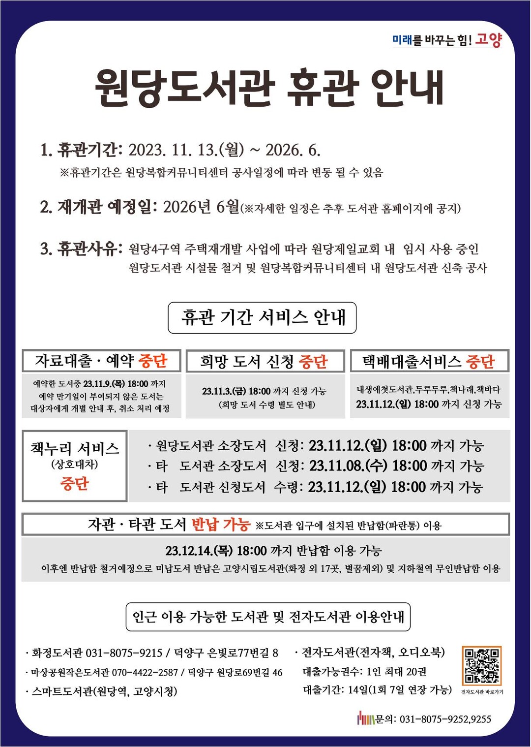 [부자동네타임즈 = 김인수 기자] 원당도서관이 11월 13일부터 휴관에 들어간다. 원당도서관은 2026년 6월 원당복합커뮤니티센터 내에서 재개관할 예정이다.