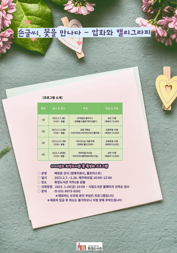 손글씨, 꽃을 만나다는 압화와 캘리그래피 체험 프로그램이다. 2월 한 달 매주 화요일 오전 10시부터 화정도서관에서 시작되며 성인과 초등학생 대상으로 4회차 운영된다.