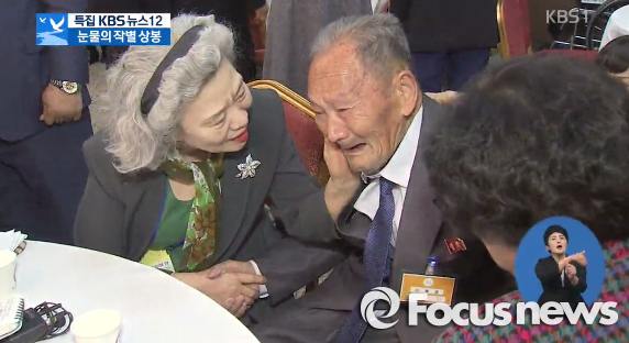 △ 남북 당국회담을 위한 실무접촉이 26일 판문점 통일각에서 열린다. 정부는 이산가족 문제의 근본적 해결을 최우선 과제로 삼고 있고 북은 금강산 관광 재개와 5·24 조치 해제를 희망하고 있다. 사진은 10월 22일 오전 진행된 이산가족 작별상봉 장면. <사진출처=KBS 뉴스 캡처> |