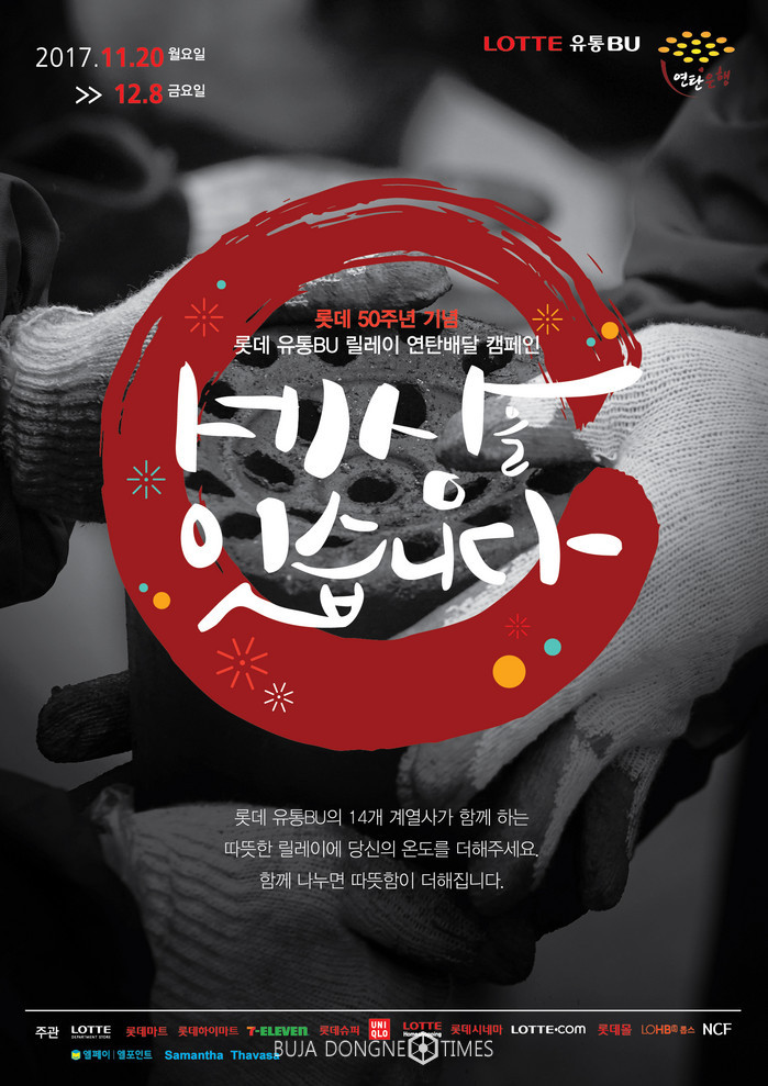 롯데유통BU는 사회복지법인‘밥상공동체 연탄은행’에 4억원 상당의 연탄 50만장을 기부하고, 수도권을 비롯한 전국 5개 지역의 불우이웃들에게 직접 연탄을 전달하는 봉사활동을 진행한다.