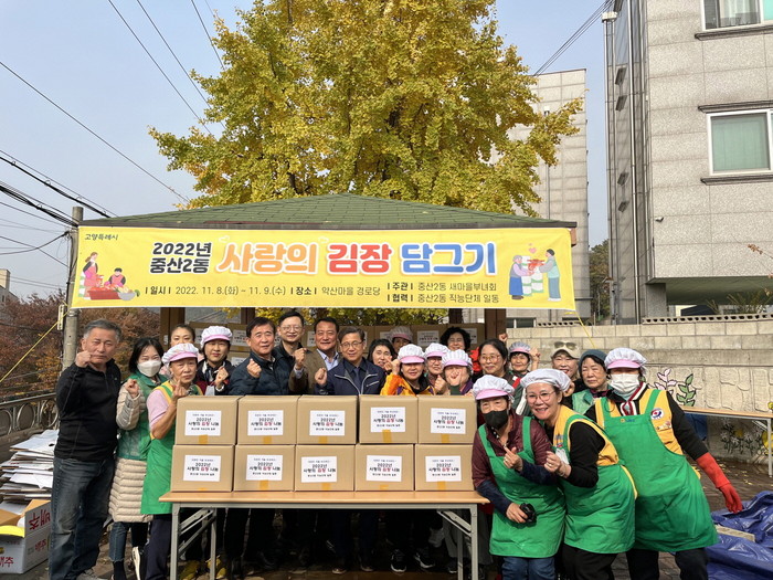 [부자동네타임즈 김인수기자] 고양특례시 일산동구 중산2동 행정복지센터(동장 남기준)는 새마을부녀회와 4개 직능단체(주민자치회, 통장협의회, 지역사회보장협의체, 적십자봉사회) 회원들이 참여한 가운데 11월 8일과 9일 양일간「2022년 사랑의 김장담그기」행사를 펼쳤다.