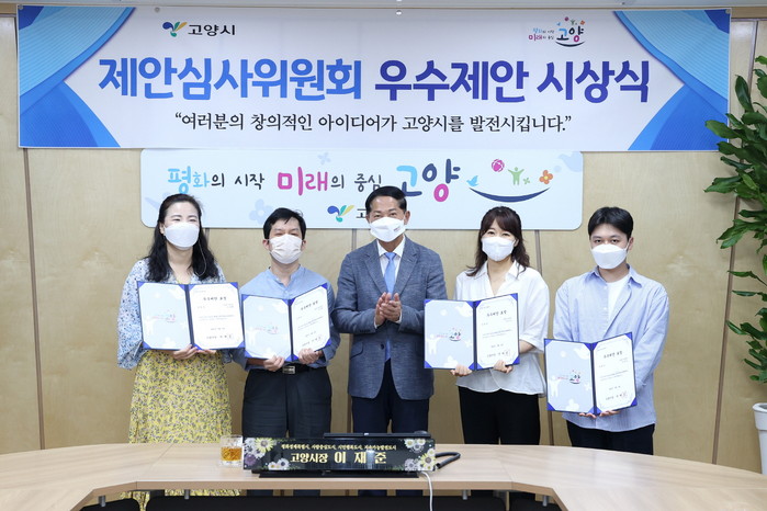 시상한 우수제안 6건은 자원봉사자 주차 할인 자동정산, 전통시장 정기 배송 시스템, 코로나19 지원금 수령 카드 통일, 폐기물 스티커 수거업체 전화번호 보이는 면에 인쇄, 고양소식지 재활용 활성화, 세솔공원 굴다리 벽화 조성이다.