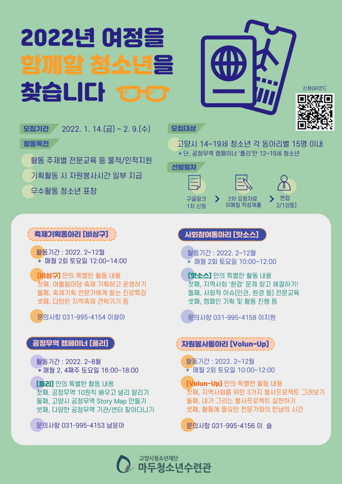 동아리 신청 자격은 고양시에 거주하고 있는 14세~19세(공정무역캠페이너는 12세~19세)로 월 1회 이상 정기적인 활동이 가능한 청소년 누구나 가능하며, 1월 14일부터 2월 9일까지 온라인 구글 신청서(QR코드)를 통해 자유롭게 신청이 가능하다.