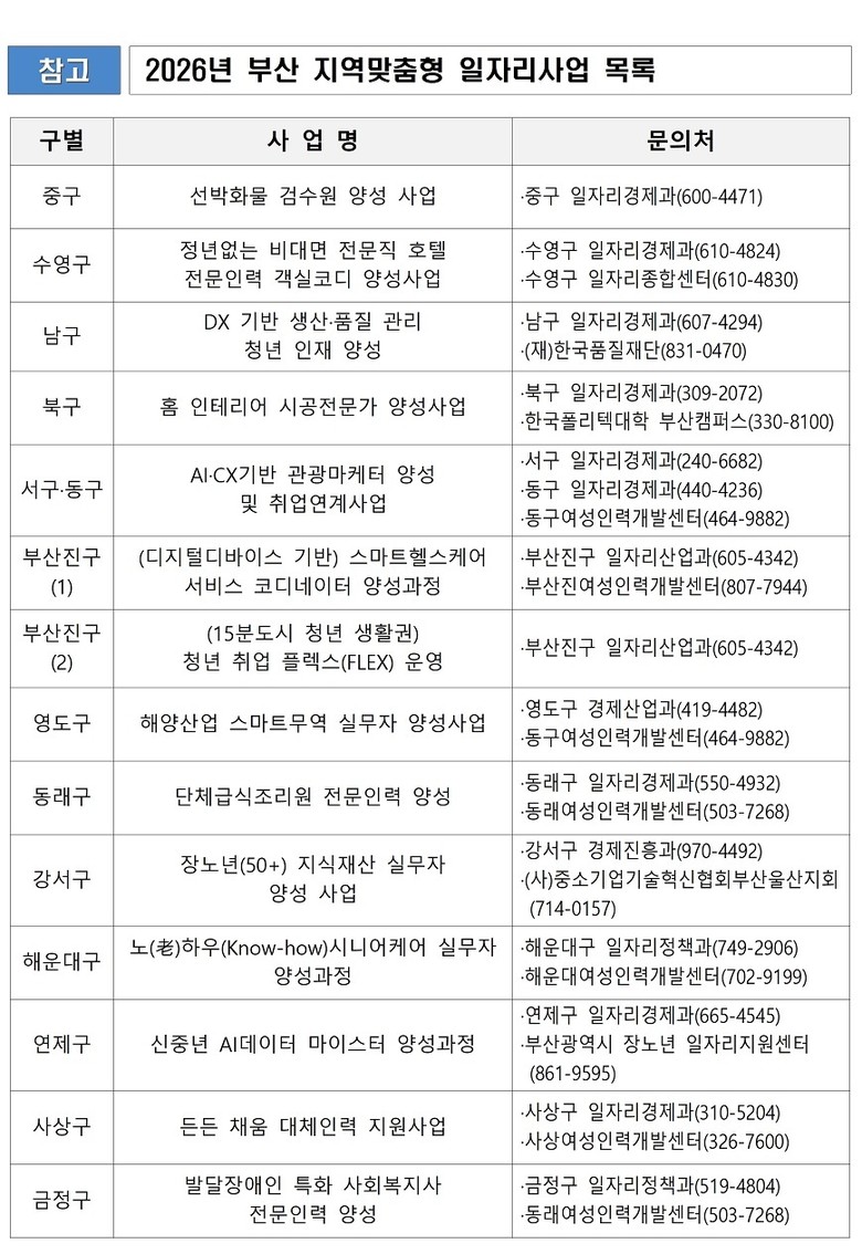 한편, '부산 지역맞춤형 일자리사업' 참여를 희망하는 구직자는 해당 구청 일자리 담당 부서나 사업별 수행기관으로 문의하면 된다.