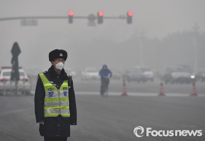 | △ (베이징/중국=신화/포커스뉴스) 중국이 수도 베이징의 대기오염 경보를 주황색에서 적색으로 상향조정한다고 7일 밝혔다. 사진은 중국 교통경찰이 스모그 속에서 마스크를 쓰고 근무하는 모습. 신화/포커스뉴스 photo@focus.kr |