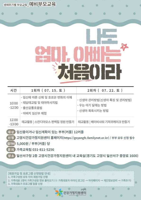 [부자동네타임즈 김인수기자] 건강가정지원센터는 오는 7월 15일(토), 22일(토) 10시부터 일산서구청 2층 교육실에서 예비부모를 위한 ‘나도 엄마,아빠는 처음이라’ 교육을 진행한다.