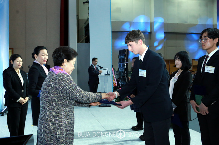 5일 오후 경기도 가평 청심국제청소련수련원 대강당에서 열린 ‘재단법인 효정세계평화재단 2017 장학증서 수여식 및 봉사상 시상식’에서 한학자 총재가 학생들에게 장학증서를 수여하고 있다. 이날 행사에는 전체 장학생을 대표하여 한국, 미국, 영국, 독일, 프랑스, 오스트리아, 브라질, 멕시코, 니카라과, 일본, 대만, 네팔, 말레이시아, 호주, 뉴질랜드, 솔로몬 제도, 러시아, 루마니아, 시리아, 이스라엘, 가나, 르완다, 우간다, 잠비아, 카메룬 등 전 세계에서 88개국 800여명의 학생수여자들이 참석했다. 2017.02.05.(사진=재단법인 효정세계평화재단 제공)