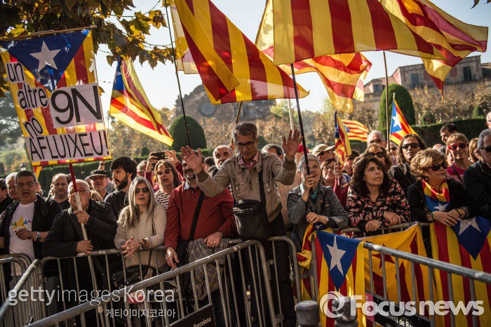 | △ (바르셀로나/스페인=게티/포커스뉴스) 9일(현지시간) 카탈루냐주 분리독립 지지자들이 깃발을 들고 주의회 밖에 집결해 투표 결과를 기다리고 있다. ⓒ게티이미지/멀티비츠 photo@focus.kr |