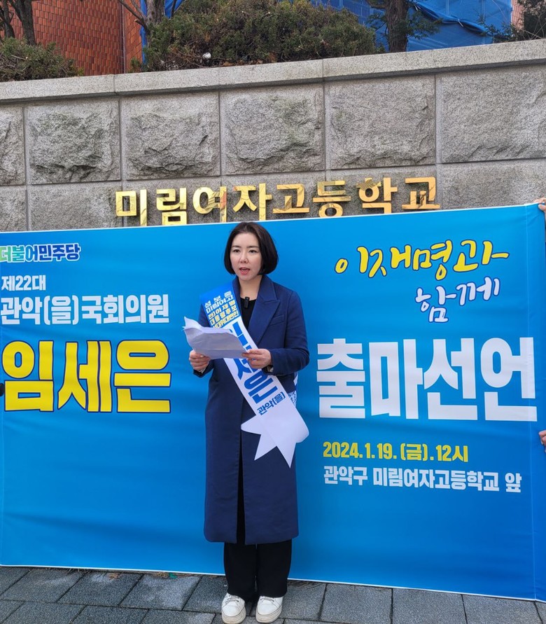 더불어민주당 임세은 국회의원 예비후보가 제22대 국회의원선거 관악구을 예비후보자 등록을 완료하고 모교인 미림여자고등학교 앞에서 출마 기자회견을 개최했다.
