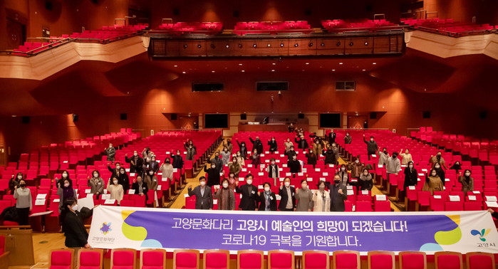 [부자동네타임즈 김인수기자] 고양문화재단(이사장 이재준)이 2021년 고양특례시 지정을 맞아 새롭게 확대·개편한 고양시 문화예술진흥 통합 공모 지원사업 2021 고양문화다리의 성과공유회가 12월 22일 수요일 오후 고양어울림누리 어울림극장에서 진행되었다. 이날 행사는 최근 강화된 정부의 코로나19 거리두기 정책을 적극 반영하여 백신접종 완료자와 PCR 검사 음성확인자에 한하여 거리두기 좌석배치와 방역이 완료된 정식공연장에서 안전하게 진행되었다. 현장에는 고양문화재단의 이사장을 맡고 있는 이재준 고양시장과, 정재왈 대표이사가 개별 프로젝트를 성공적으로 마무리한 지역예술인 100여명을 따뜻하게 맞았다. 더불어 내빈으로 고양시의회 문화복지위원회의 정봉식 위원장을 비롯한 문복위 의원들이 참석하여 예술인들을 축하하였다.