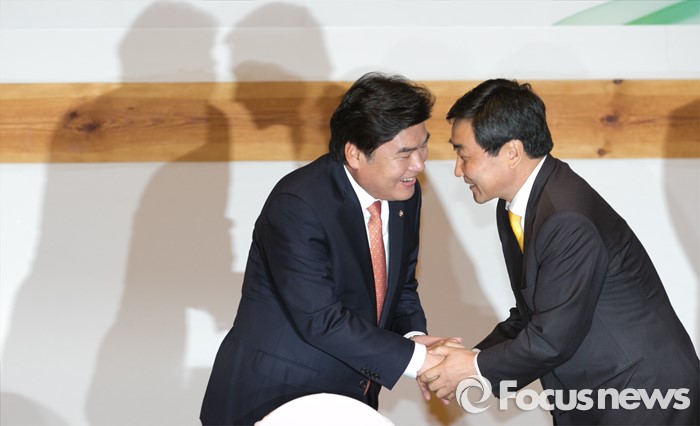 | △ 지난달 29일 오전 서울 여의도 국회 사랑재에서 열린 경제단체장 초청 여야 원내대표 및 정책위의장과의 간담회에 앞서 원유철(왼쪽) 새누리당 원내대표와 이종걸 새정치민주연합 원내대표가 인사하고 있다.<사진제공=포커스뉴스> |