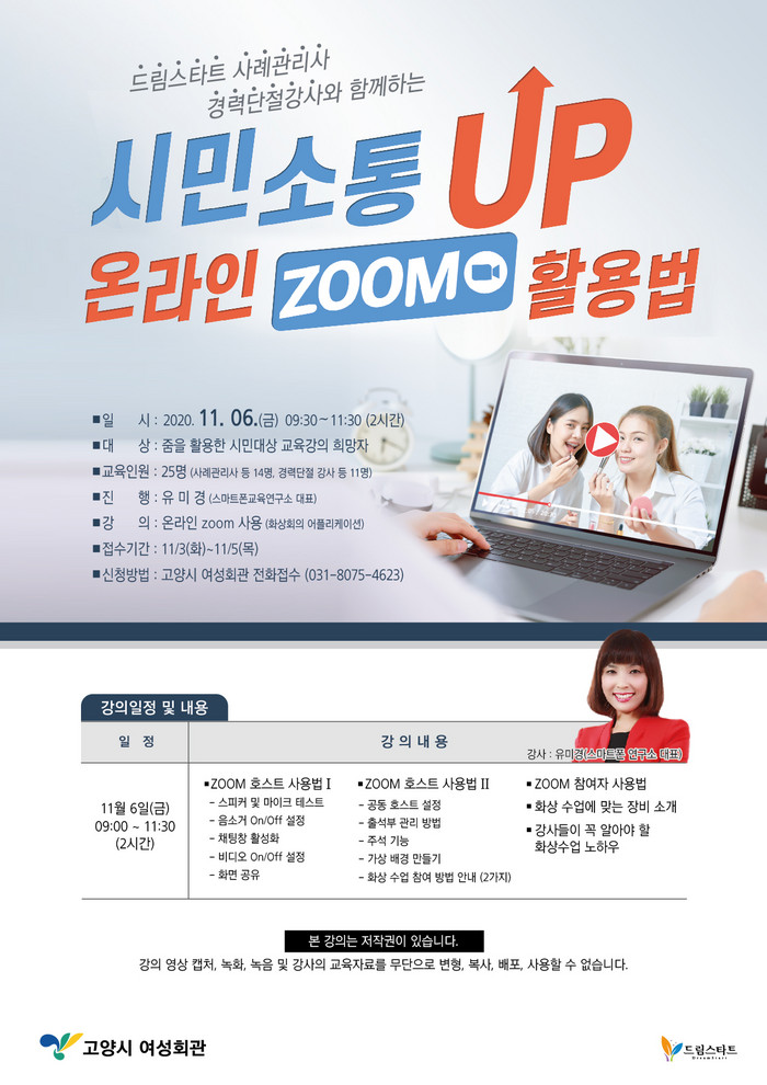 한편, 이번 ‘on줌(zoom) 활용법’ 강좌는 고양시 여성가족과에서 추진하는 여성 역량강화 및 경제력 상승도모를 위한 ‘여성회관 온라인강좌 운용’과, 고양시 아동청소년과의 주요 사업인 ‘드림스타트 사업의 사례관리자 역량강화 사업’을 동시에 충족하는 신설 강좌로, 고양시의 부서 간 협업의 좋은 사례로도 평가받고 있다.