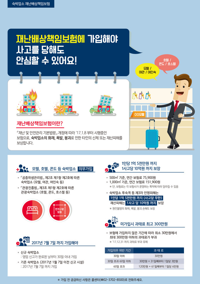 화재보험은 화재로 인한 자기 재물(건물, 집기 등)에 대한 피해를 보상해주는 보험인 반면, 재난배상책임보험은 화재·폭발·붕괴로 인한 생명과 재산을 보장해주는 보험으로 최고 10억 원까지 보장된다. 보험에 대한 자세한 사항은 콜센터으로 문의하면 된다.